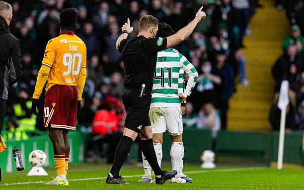 Initially, Beaton had awarded Motherwell a goal kick after a corner saw Daizen Maeda head the ball wide. But assistant VAR Kevin Clancy advised a review after replays showed Motherwell defender Emmanuel Longelo holding Maeda inside the penalty area. Following the check, Beaton awarded Celtic a penalty and issued Longelo a straight red card.